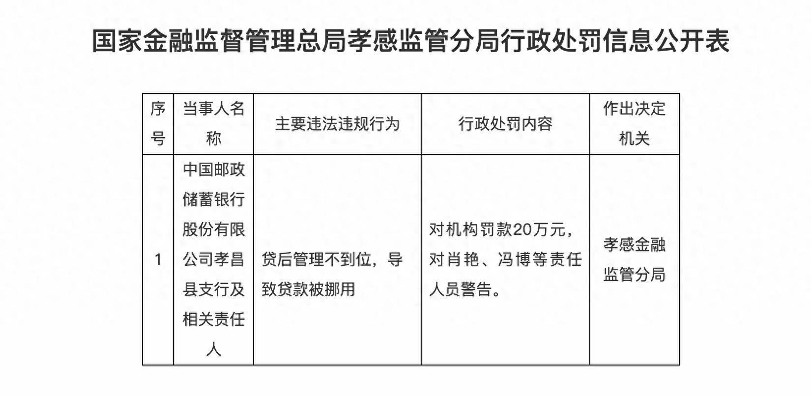 行政处罚决定书表现,中国邮政储蓄银行股份有限公司孝昌县支行存在“贷后解决不到位,导致贷款被挪用”的主要犯罪非法事实。针对上述行径,国度金融监督解决总局孝感监管分局依据干系法律划定赌钱赚钱app,对该支行作出罚金东说念主民币20万元的行政处罚决定。同期,对该非法事件负有攀扯的个东说念主肖艳、冯博等东说念主均被给予告诫。(信网记者)